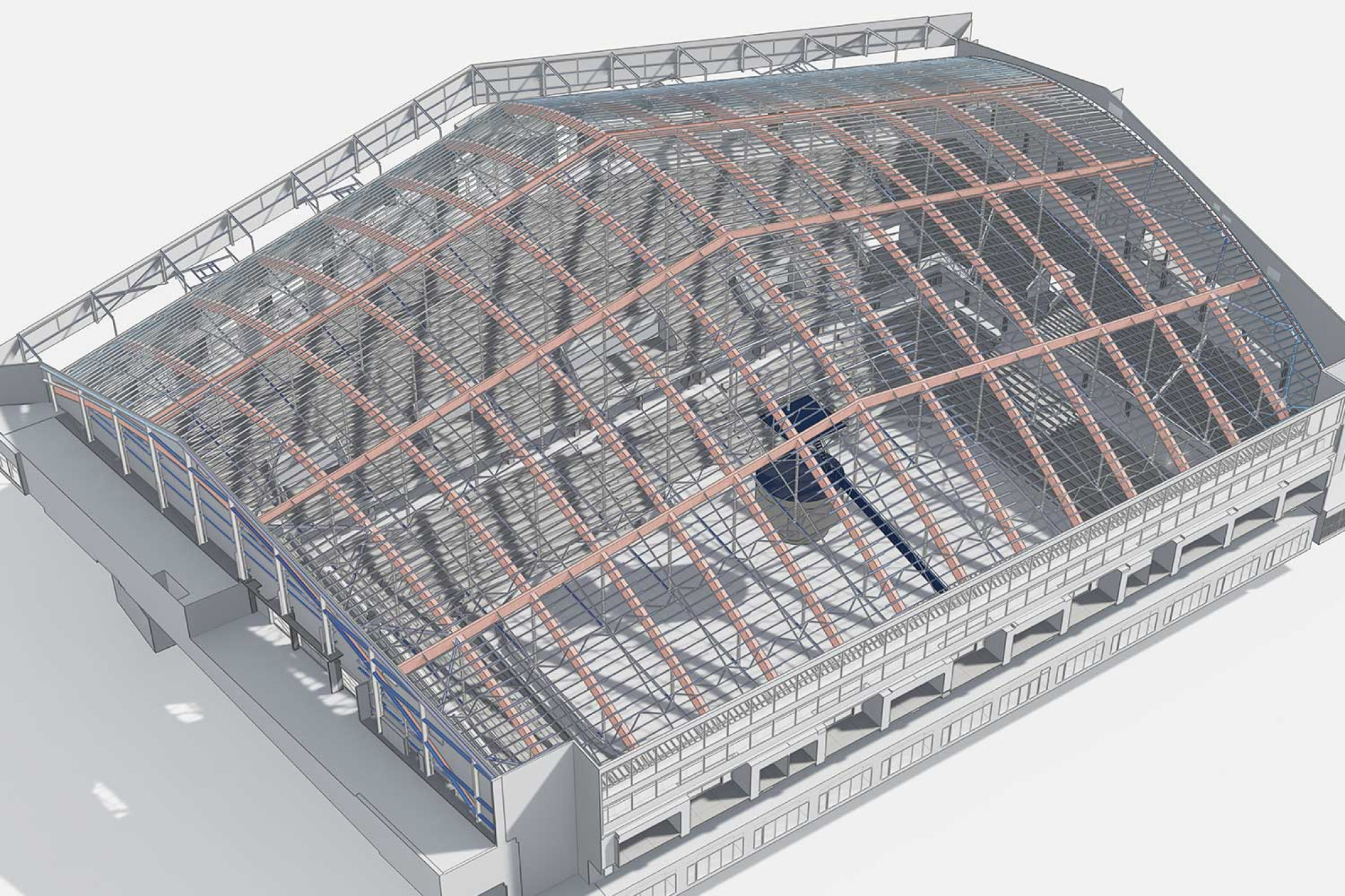 Mit 3D-Laserscanning nahm die HMQ AG die Tragkonstruktion der Arena auf. Die besondere Herausforderung lag in der detaillierten Erfassung der Dachkonstruktion: die Auflager der Hauptträger auf den Stützköpfen sowie die Montagekonstruktion des Videowürfels erforderten höchste Präzision. Auf Basis der gewonnenen Punktwolke modellierte das Team ein 3D-Architekturmodell in ArchiCAD, das Architekten, Bauingenieuren und Fachplanern als zuverlässige Grundlage für die Sanierungsplanung dient.