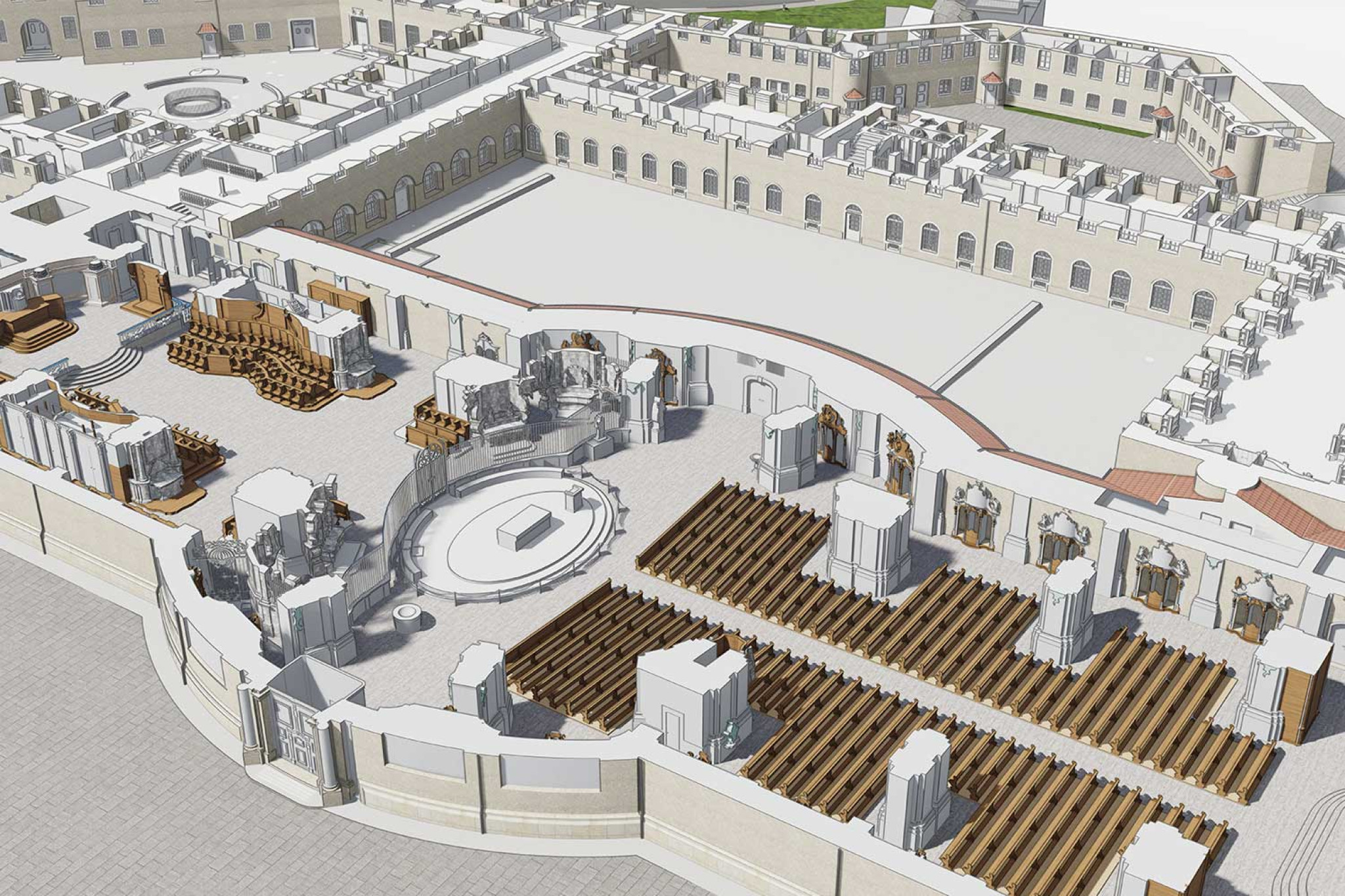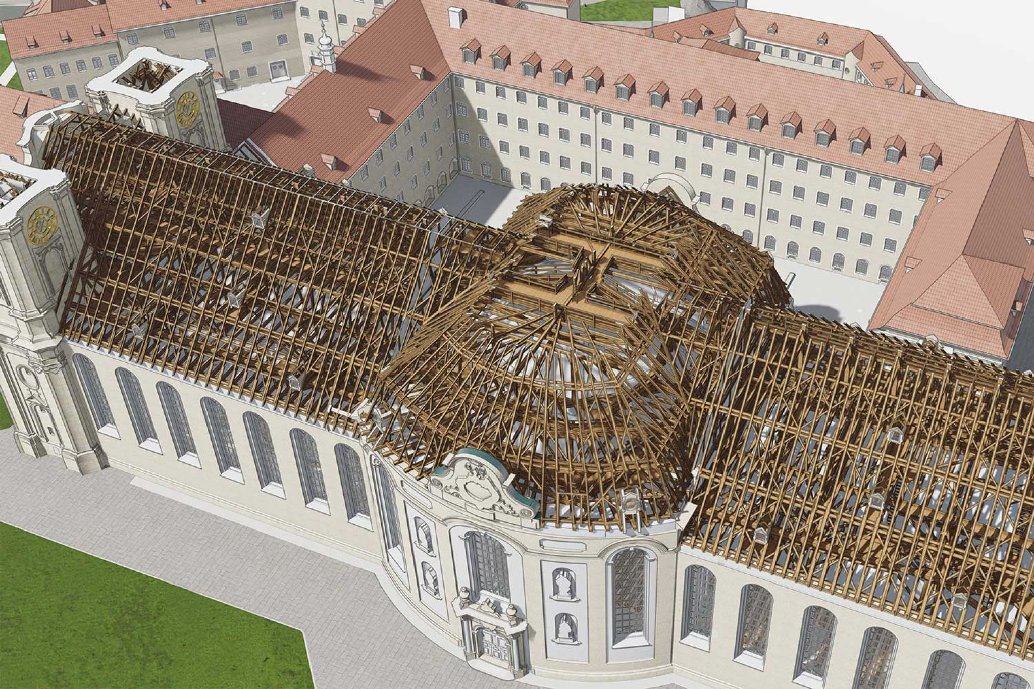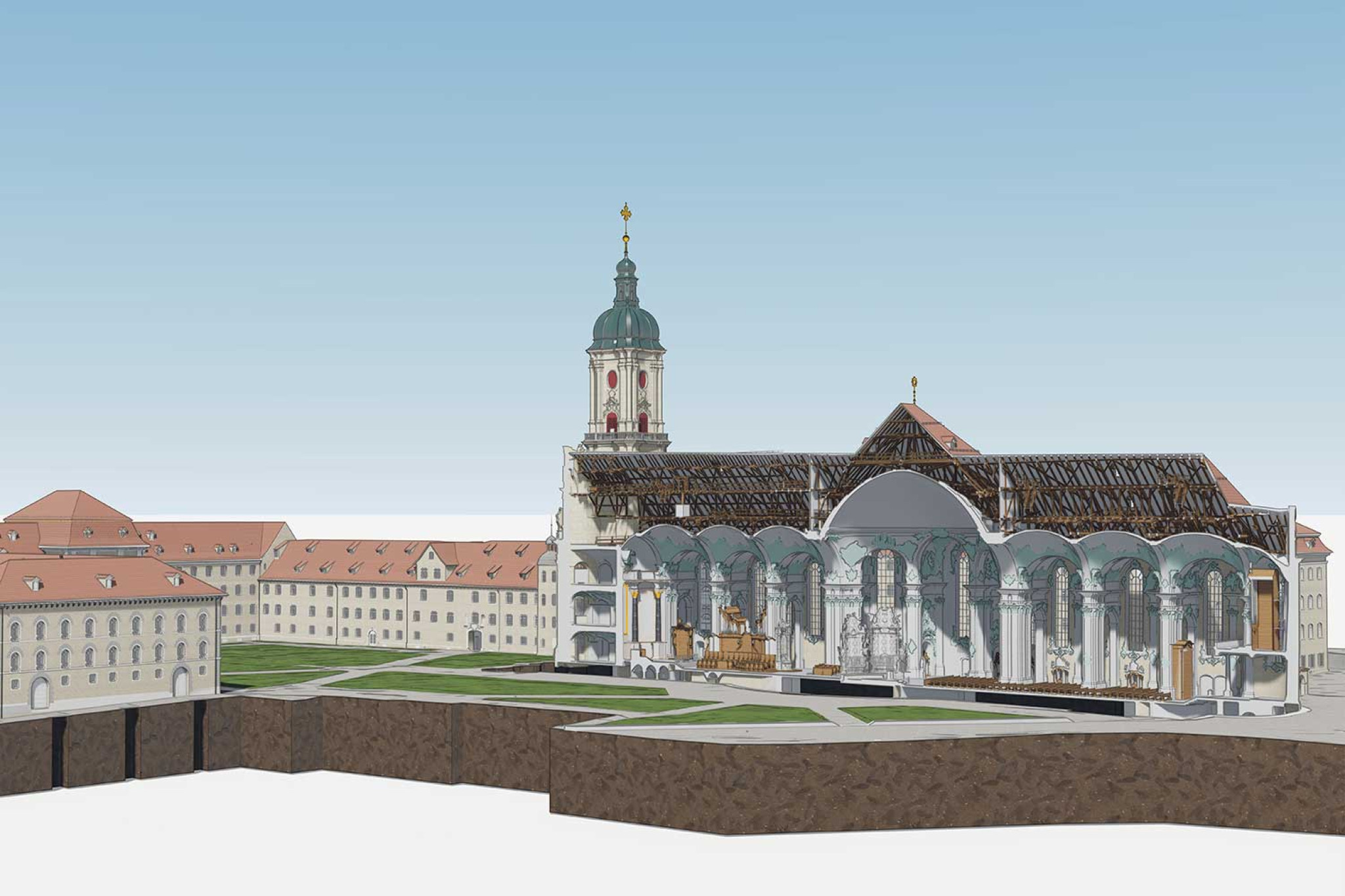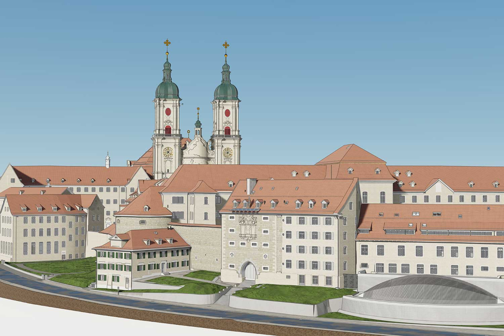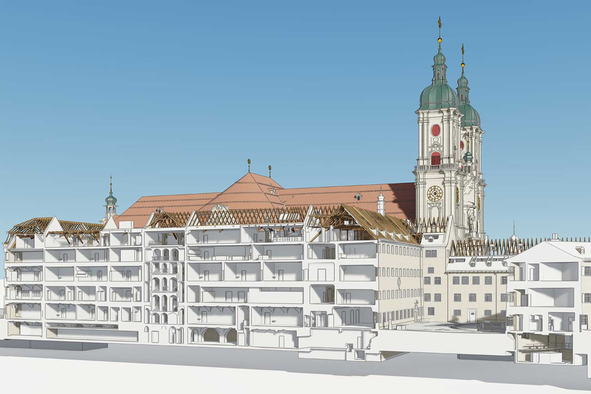 Auf Basis der 3D-Punktwolke modellierte die HMQ AG ein vollständiges 3D-Modell des gesamten Areals in ArchiCAD. Dieses umfasst die Kathedrale mit Klosterhof, das Regierungsgebäude, das Karlstor sowie die Gebäude entlang der Moosbruggstrasse bis hin zu Teilen der Zeughausgasse. Damit wurde das Herzstück der Stadt St. Gallen digital vollständig erfasst und in einem konsistenten Gesamtmodell abgebildet.